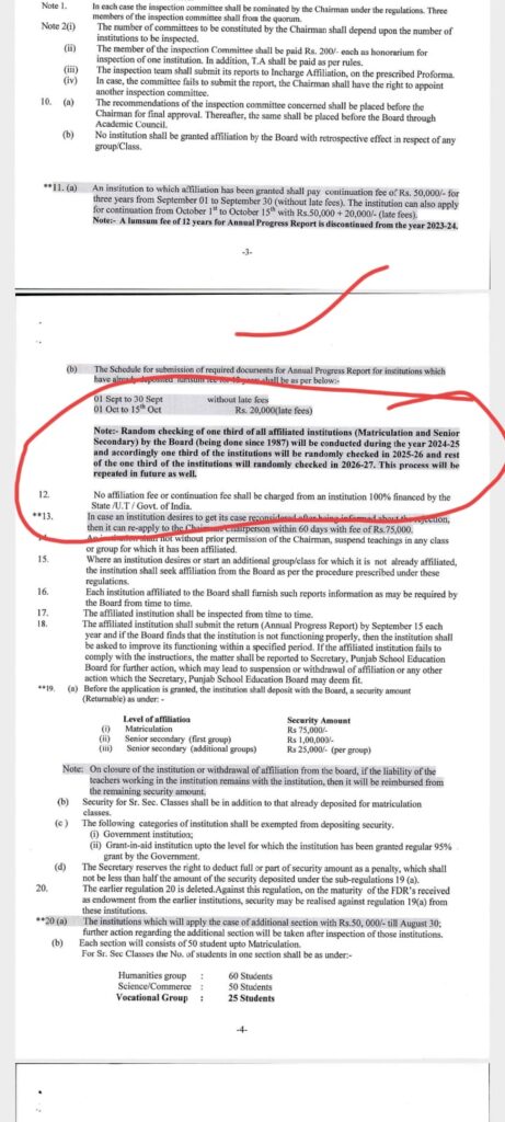 पंजाब स्कूल शिक्षा बोर्ड ने हाल ही में नए एफिलिएटिड स्कूलों को एफीलिएशन देने के लिए नियम बनाए हैं। ताई किए गए नियमों को लागू करने के लिए पंजाब स्कूल शिक्षा बोर्ड ने नोटिफिकेशन जारी किया है। इस नोटिफिकेशन में बोर्ड ने कहा है कि 1987 से लेकर अब तक चल रहे एफिलिएटिड स्कूलों की जांच करवाई जाएगी। बोर्ड हर साल एक तिहाई स्कूलों की जांच करेगा और इस तरह यह जांच 3 साल में पूरी हो सकेगी। पंजाब स्कूल शिक्षा बोर्ड पुराने एफिलिएटिड स्कूलों में एफीलिएशन के माप दंड पूरे हो रहे हैं या नहीं इसकी बारीकी से जांच करेगा। बोर्ड जांच के जिला स्तर पर कमेटियां गठित करेगा। एफिलिएटेड स्कूल संचालकों ने कंटीनुशन फॉर्म में जो सुविधाएं लिखी हैं क्या वो स्कूलों में दी जा रही हैं। स्कूल टीचर, लाइब्रेरी, लेबोटरी, पर्याप्त क्लासरूम, पीने का पानी जैसी सुविधाओं के संबंध में जांच की जाएगी। अब सवाल यह उठता है कि आखिर पंजाब स्कूल शिक्षा बोर्ड को अब स्कूलों की जांच करवाने की याद कहां से आई।